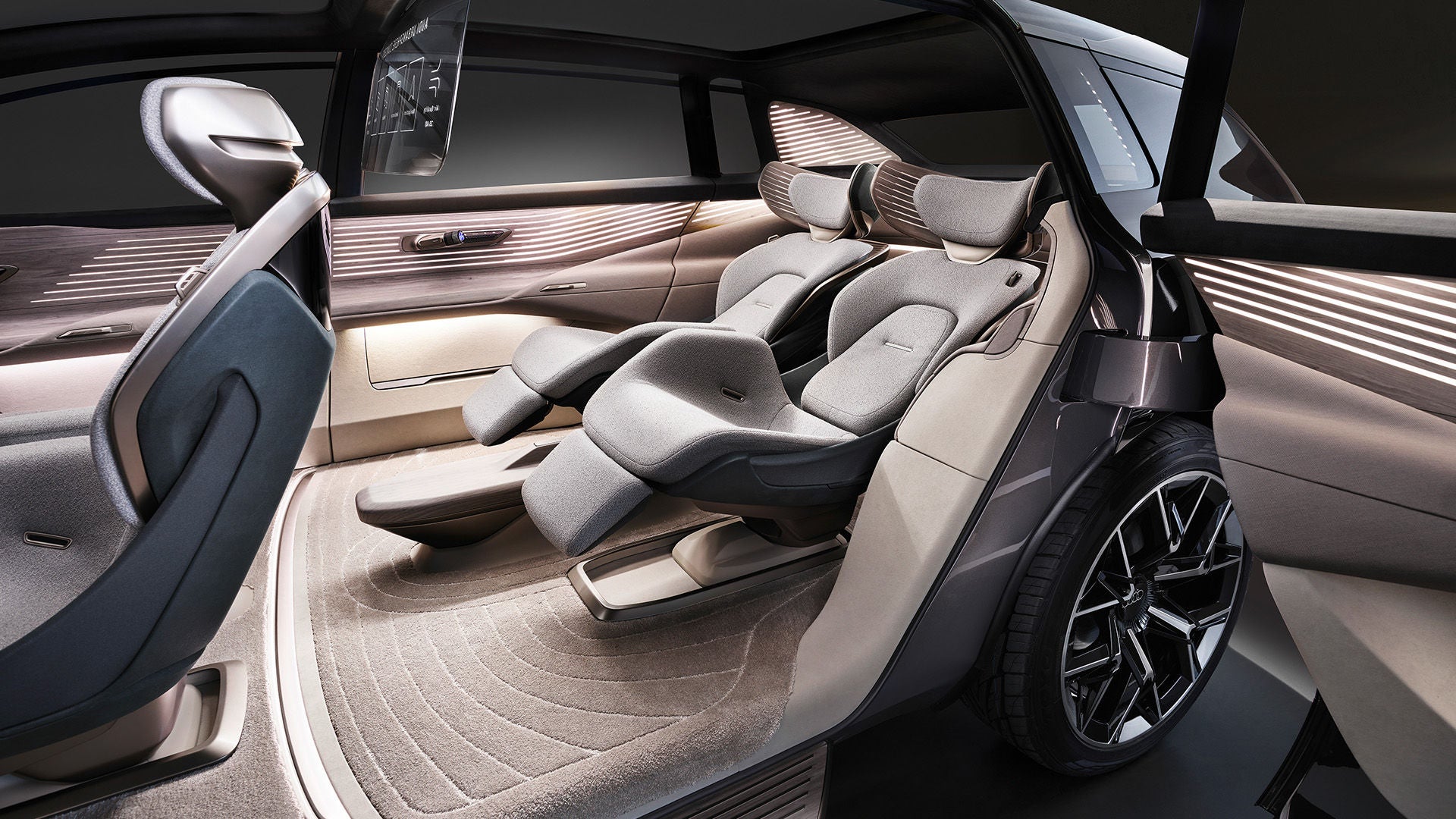 Wnętrze Audi urbansphere concept wykonano z drewna, wełny i syntetycznych materiałów tekstylnych. Najwyższej jakości boazerie, obicia siedzeń i wykładziny podłogowe są przyjemne w dotyku. Wiele materiałów użytych w pojeździe pochodzi z upraw ekologicznych lub może zostać poddane ponownemu recyklingowi.